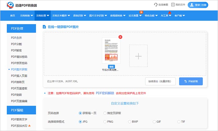 步骤一:在电脑上下载并安装迅捷PDF转换器,打开工具,找到【PDF操作】-【PDF图片提取】功能。点击【添加文件】或是直接拖拽文件至指定位置,均可将PDF文件导入工具。一般情况下,工具会支持批量处理文件,可一次性上传多份文件同时进行操作。