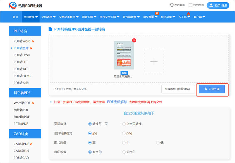 4.除了转换格式,还可以对转换的图片质量、水印设置等进行调整。点击【开始转换】按钮,网站会迅速处理并生成图片文件。